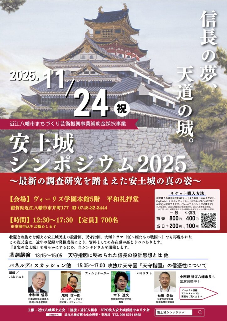 ・日時:2025年11月24日(月祝) ・場所:ヴォーリズ学園本館5階 滋賀県近江八幡市市井町177 近江八幡市の信長の館や安土城郭資料館は、『天守指図』をもとに展示されていますが、安土城の真の姿については未だ様々な説が存在しています。 そこで、日本城郭協会理事長の小和田哲男先生をゲストにお招きし、元エンジニアで歴史家の”ヒストリア・ノブロウ”氏(近江八幡市郷土史会理事)が唱える安土城の姿について真剣な議論・意見交換を行い、「真実の安土城」に迫ります。 地元市民をはじめ、多くの方々にご参加いただき、「真実の安土城」やその魅力を近江八幡市から国内外へ広げてゆきましょう!